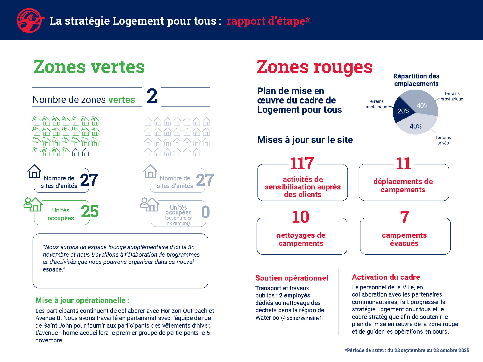 Bien que la province soit responsable de diriger les efforts pour lutter contre l’itinérance dans toutes les municipalités du Nouveau-Brunswick, la ville de Saint John s’engage à appliquer des ressources pour soutenir les efforts visant à aider à lutter contre l’itinérance et à augmenter la capacité de meilleures options pour ceux qui dorment à la belle étoile à Saint John. Le développement de la politique Logement pour tous visait à garantir que tous les citoyens de Saint John se sentent en sécurité et respectés, tout en respectant les décisions de la Cour suprême du Canada en ce qui concerne le droit d’un individu à un logement adéquat. En tant que municipalité, nous avons l’obligation de garantir des objectifs et des résultats fondés sur les droits de la personne tout en préservant la dignité.